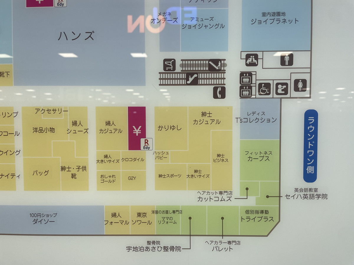 ラウンドワン側のエスカレーターを登っていただき、右手に進むと左側にあります。 -