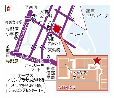 「イーストベイステイションマリンプラザあがり浜」ショッピングセンター内、美容室アースさんとヴァインドラッグさんの間の入口廊下から入って、あがりはまクリニックの隣。紫ののぼりが目印です。 -