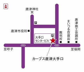 JR唐津線唐津駅の北口から市役所方面へ徒歩5分。市役所の右隣、大手口センタービル2階です。
