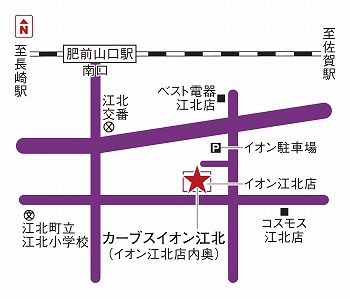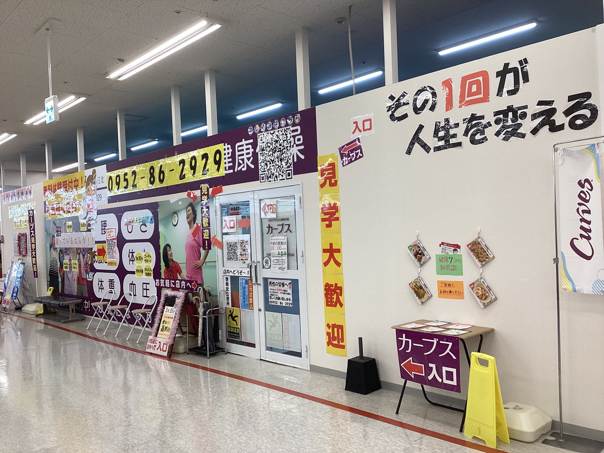 イオン江北店ダイソー側入り口をまっすぐに進んでもらい、突き当たりを右に曲がるとカーブスがあります