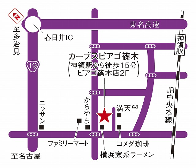 JR中央線神領駅より徒歩15分。ピアゴ篠木店正面入り口から入り、右のエスカレーターで2階へ。ヘアカラー屋さんとセリアさんの間の通路を進み、パソコン教室さんの隣がカーブスピアゴ篠木店です。