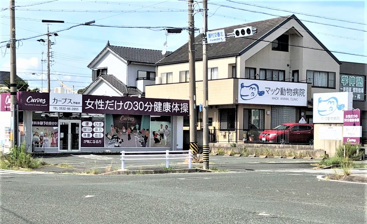 国道1号線「岩屋町西交差点」より東三河環状線(県道31号線)へ曲がり、マック動物病院様のお隣、飯村交番の反対側のむらさき色の看板のカーブス豊橋東店