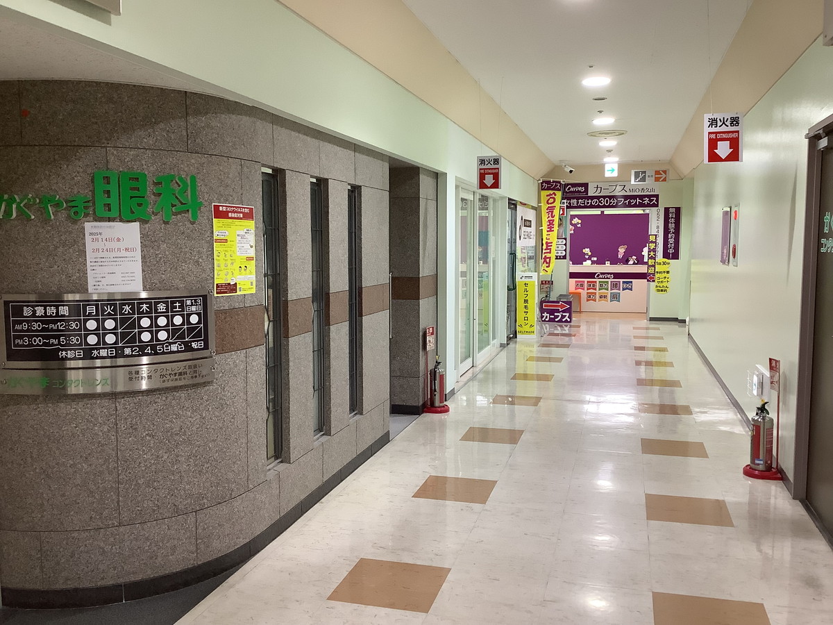 株山中央通り香久山交差点角。MiО香久山本館2階(MEGAドン・キホーテ内)。南側入口からエレベーターで2階に行き、まっすぐ進みかぐやま眼科さんを通り過ぎた突き当たり。