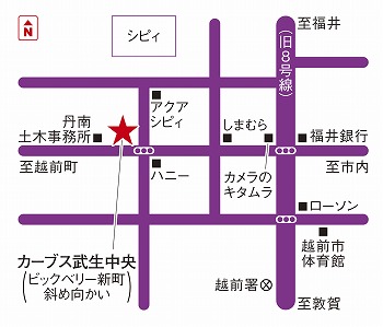 県道28号線の大虫口交差点をカメラのキタムラ武生店様側に曲がり直進した先のハニービックベリーマーケット新町店様の斜め向かい側がカーブス武生中央店です