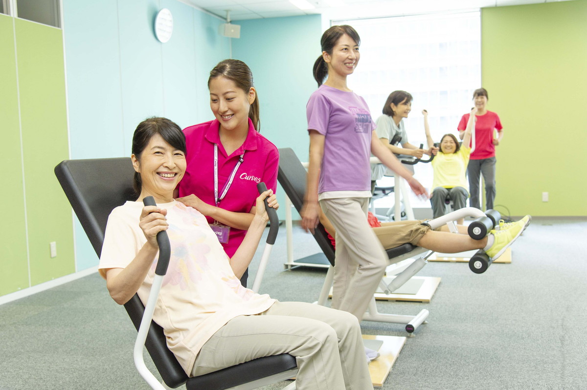 広い店内で10代から80代の幅広い年代の女性がお悩み改善のために元気に運動をされています。 -