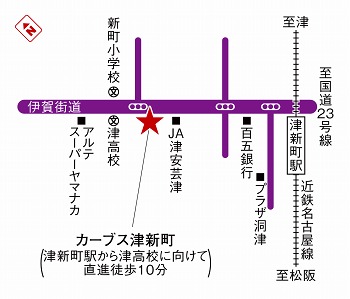 津新町駅から津高校さん方向へ。JA津中央津店を過ぎたらカーブスがあります。津高校さん手前です。