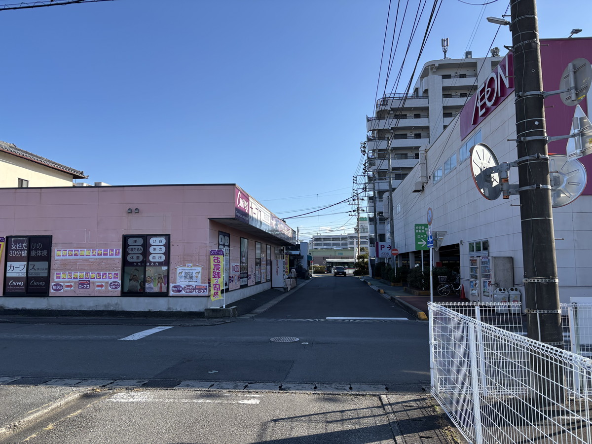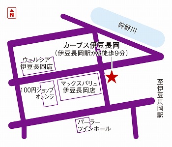 伊豆長岡駅から出て直進し千歳橋を渡ります。左手にパーラーツインさんが見て歩横断歩道を渡ると左手にマックスバリュー伊豆長岡店さんが見えます。その向かい側がカーブス伊豆長岡店です。