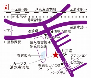 バスの場合‥静鉄三保草薙線、有東坂停留所より徒歩1~2分。車の場合‥南幹線、有東坂交差点を三保方面に曲がり400m先。有東坂しいのきクリニックさんの隣。 -