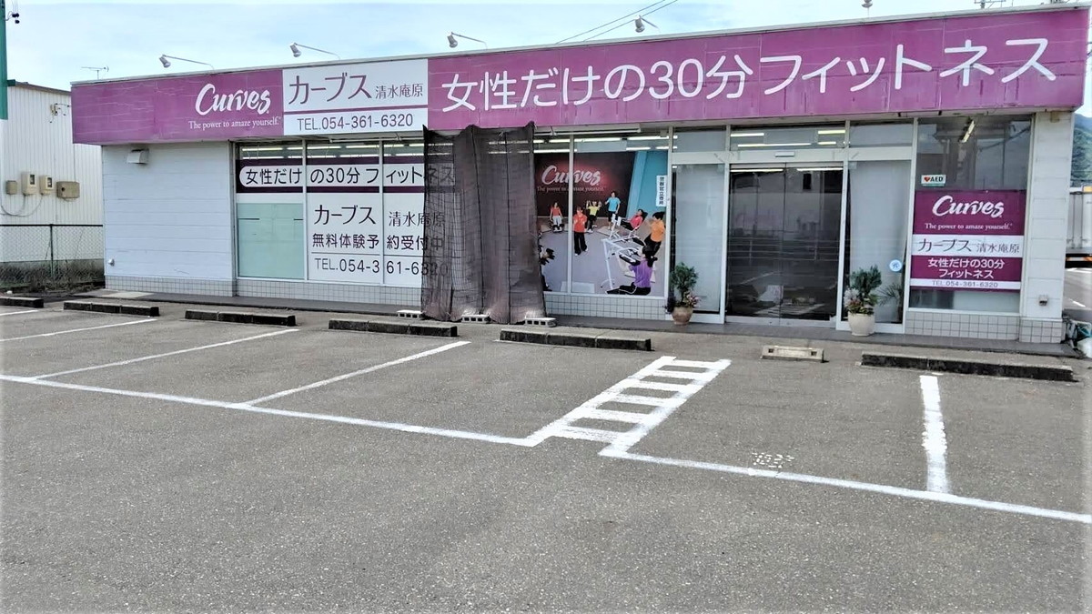 東名高速道路清水インターの道を由比方面へ、1つ目の信号機(西久保交差点)を左折して100m先の左手側がカーブス清水庵原です