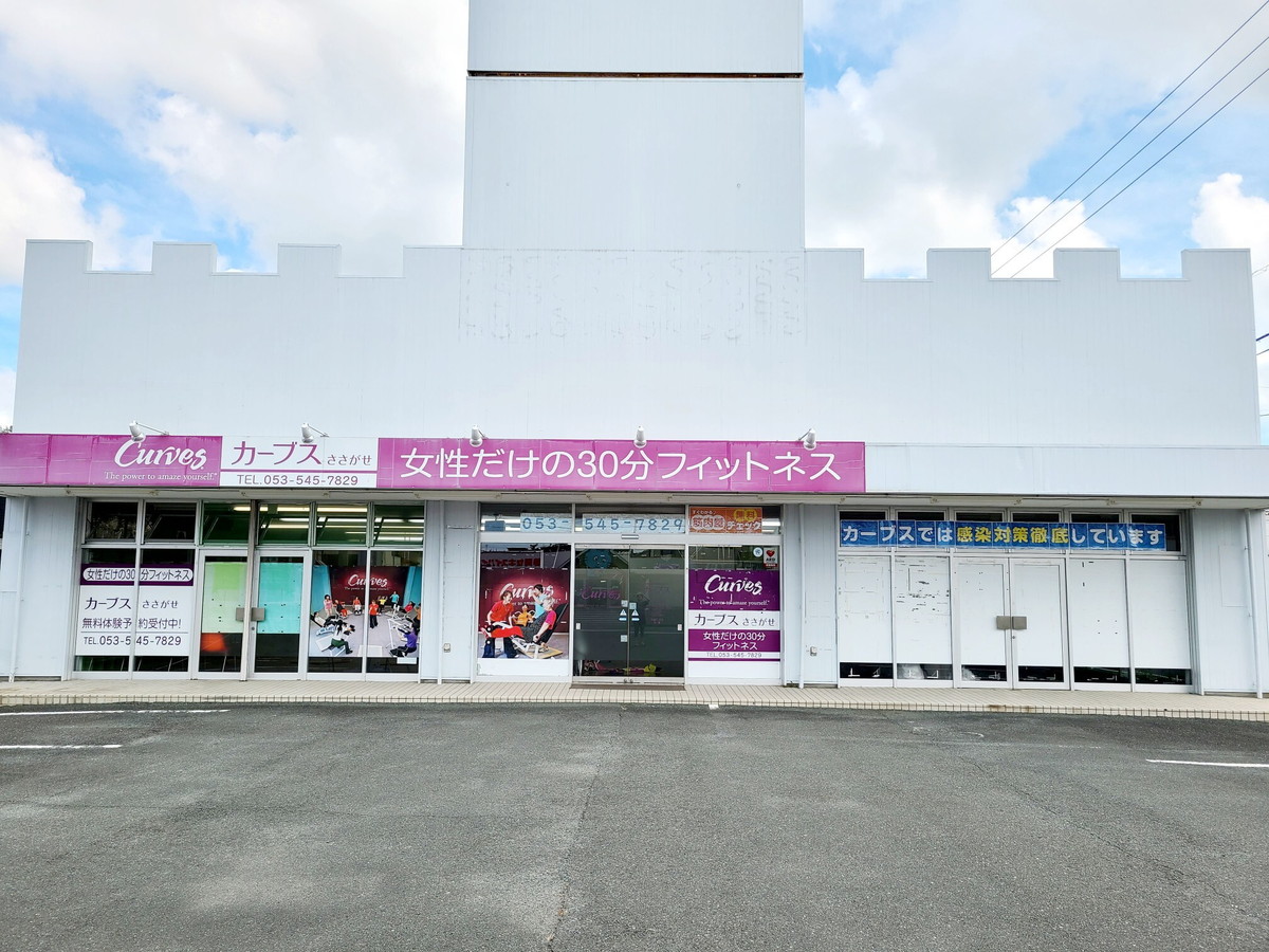 旧笠井街道を南へ直進し、ドミノ・ピザさんのある原島交差点を左折して200m先、やきとり屋すみれさんのお隣がカーブス浜松ささがせです
