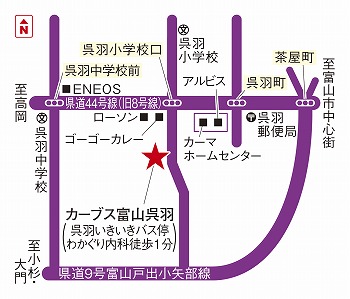 呉羽小学校口の信号を高岡方面に左折し、豆腐のみのたけやさんの向かいに、あります! -