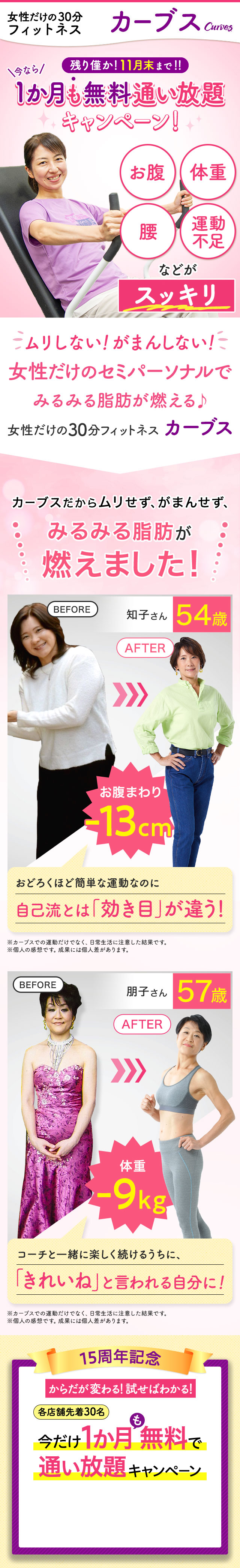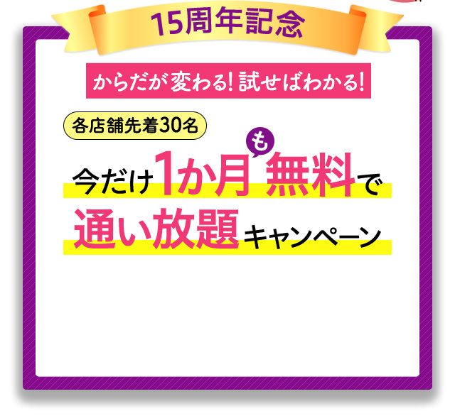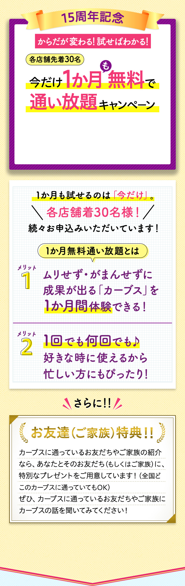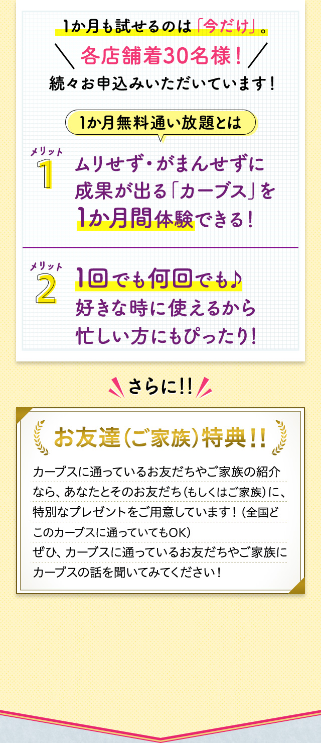 お好きなカーブス店舗に1か月間、期間中1回でも何回でも、好きなだけ通えます。 自分にあっているか?他と比べてどうか?など、しっかり試してご確認ください。 1か月無料通い放題に申し込まれるか、ご来店当日にお決めいただけます。 まずは1回ご来店ください。