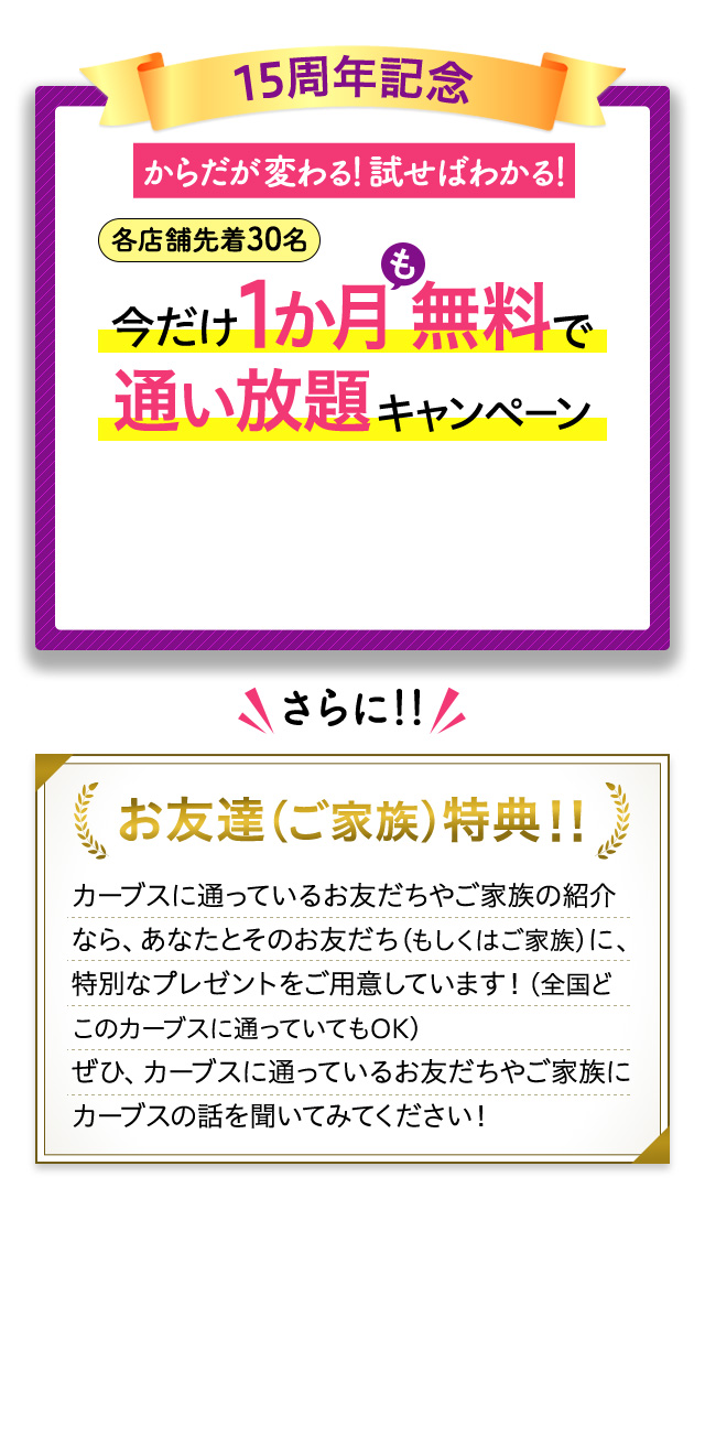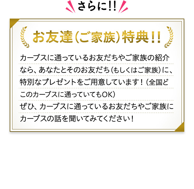 カーブスに通っているお友だちやご家族のご紹介なら、あなたとそのお友だち(もしくはご家族)に特別なプレゼントをご用意しています!(全国どこのカーブスに通っていてもOK※) ぜひ、カーブスに通っているお友だちやご家族にカーブスの話を聞いてみてください! ※一部、特典対象外の店舗がございます