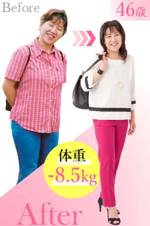 すると、体重やウエストが少しずつ減って、通うのが楽しみになったんです。体が軽くなると、動くのもおっくうにならず、食事も食べすぎなくても満足できるなどよいことばかり。今、毎日がすごく楽しいです。