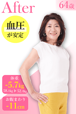 血圧が高くなり、健康診断でE判定が出ていたのですが、カーブスに通うようになってから、自然と下がっていきました。その他のメタボの指標もすべてよくなって、検査の人にびっくりされたくらいです。運動って大事だなと思いました。