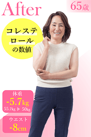 50歳を過ぎたころ、コレステロール、中性脂肪、肝機能などの数値が悪化し、医師から「1日30分の運動と、食事に気を付けるように」言われました。カーブスで運動し、食事も意識するようにしたところ、1年後の健康診断では、すべて正常値に。今では病気知らずです。